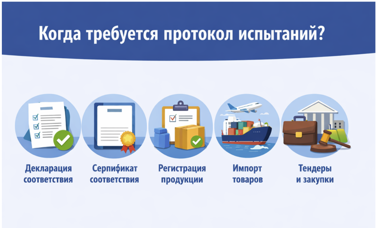 Документ подтверждает, что образцы товара были протестированы по установленным стандартам — например, по требованиям технических регламентов, ГОСТов.