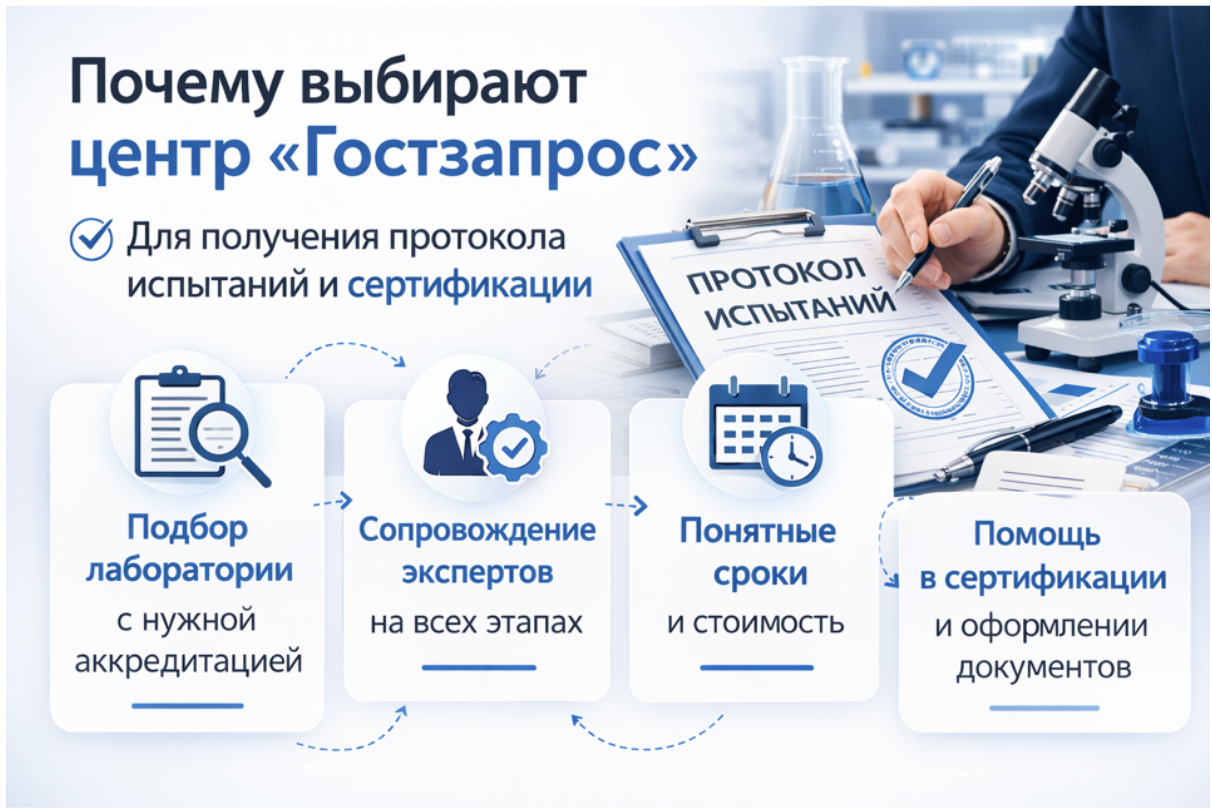 Специалисты центра «Гостзапрос» помогут определить требования к продукции, организовать проведение лабораторных тестов и получить протокол испытаний в установленные сроки.