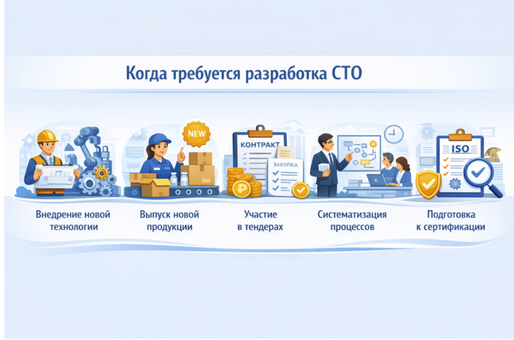 СТО разрабатывается на основании требований законодательства о стандартизации и может учитывать положения действующих ГОСТов, технических регламентов и отраслевых нормативов.
