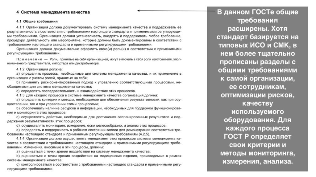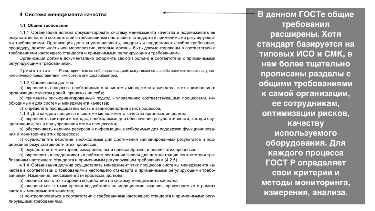 В отличие от общего стандарта качества ISO 9001, данный норматив ориентирован именно на медизделия. В нём особое внимание уделяется: